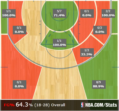 Over the past two games for the Warriors, Curry’s combined stat line is 92 points, 32-48 on field goals, 18-23 from the 3-point line, 10-11 from free throws, and 11 assists. This numbers are absolutely unreal in terms of efficiency. Take a look at this shot chart representing the past two games for Curry: