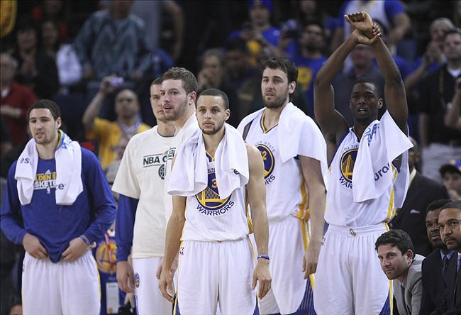 April 09, 2013; Oakland, CA, USA; Golden State Warriors bench of starters stand up for the final seconds of the game against the Minnesota Timberwolves during the fourth quarter at Oracle Arena. The Golden State Warriors defeated the Minnesota Timberwolves 105-89 to clinch a playoff berth. Mandatory Credit: Kelley L Cox-USA TODAY Sports