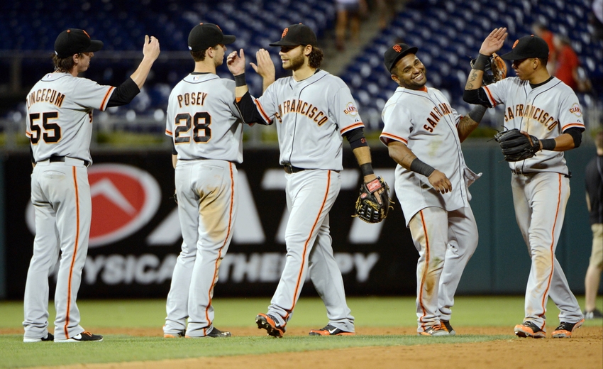 Jul 22, 2014; Philadelphia, PA, USA; The San Francisco Giants celebrate beating the Philadelphia Phillies 9-6 in14 innings at Citizens Bank Park. Mandatory Credit: Eileen Blass-USA TODAY Sports