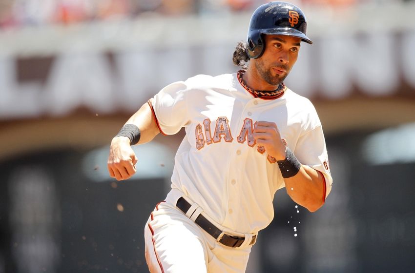 May 26, 2014; San Francisco, CA, USA; San Francisco Giants outfielder Angel Pagan (16) prepares to round third base before scoring a run against the Chicago Cubs in the first inning at AT&T Park. Mandatory Credit: Cary Edmondson-USA TODAY Sports