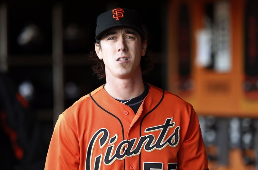 Jul 11, 2014; San Francisco, CA, USA; San Francisco Giants starting pitcher Tim Lincecum (55) look across the field from the Giants dugout before the game against the Arizona Diamondbacks at AT&T Park. Mandatory Credit: Bob Stanton-USA TODAY Sports