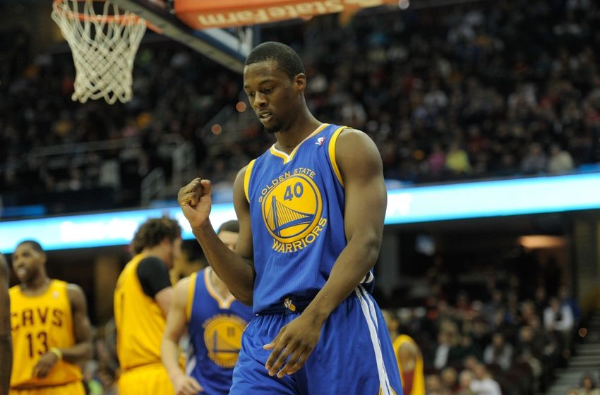 Dec 29, 2013; Cleveland, OH, USA; Golden State Warriors small forward Harrison Barnes reacts during a game against the Cleveland Cavaliers at Quicken Loans Arena. The Warriors won 108-104. Mandatory Credit: David Richard-USA TODAY Sports
