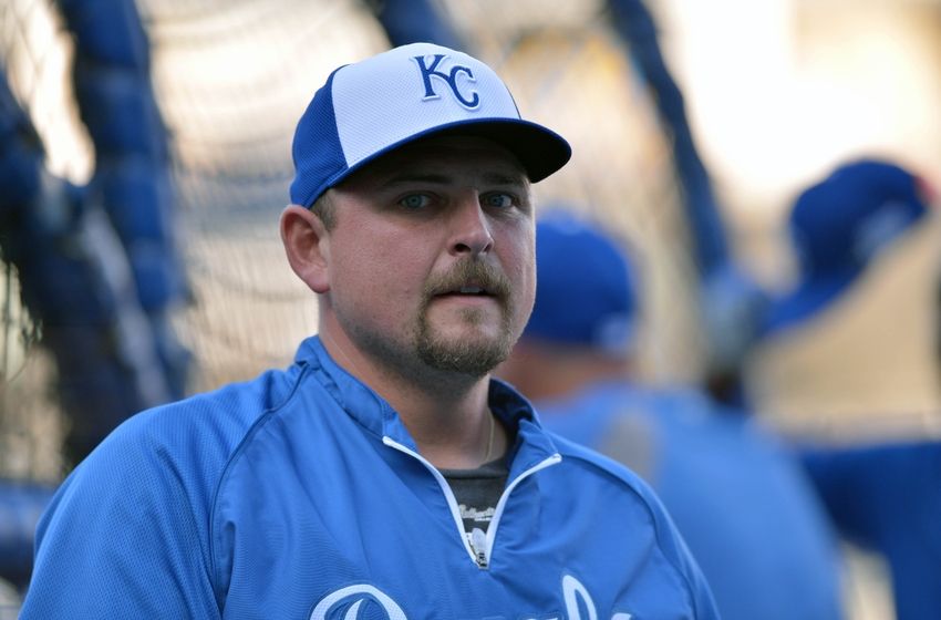 Sep 30, 2014; Kansas City, MO, USA; Kansas City Royals designated hitter Billy Butler (16) looks on during batting practice prior to the 2014 American League Wild Card playoff baseball game against the Oakland Athletics at Kauffman Stadium. Mandatory Credit: Denny Medley-USA TODAY Sports