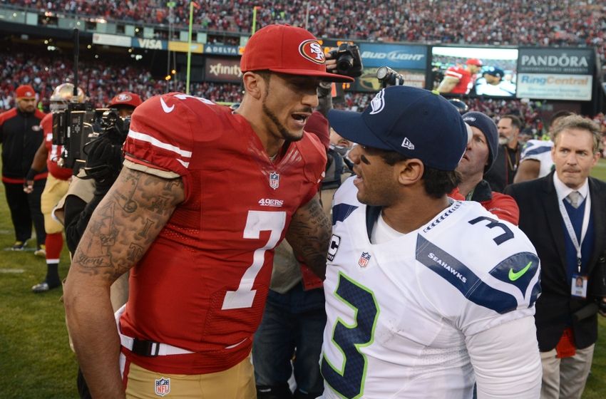 December 8, 2013; San Francisco, CA, USA; San Francisco 49ers quarterback Colin Kaepernick (7) shakes hands with Seattle Seahawks quarterback Russell Wilson (3) after the game at Candlestick Park. The 49ers defeated the Seahawks 19-17. Mandatory Credit: Kyle Terada-USA TODAY Sports