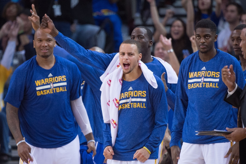 January 7, 2015; Oakland, CA, USA; Golden State Warriors guard Stephen Curry (30, center) celebrates on the bench during the third quarter against the Indiana Pacers at Oracle Arena. The Warriors defeated the Pacers 117-102. Mandatory Credit: Kyle Terada-USA TODAY Sports