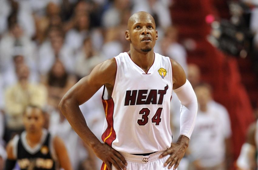 Jun 10, 2014; Miami, FL, USA; Miami Heat guard Ray Allen (34) reacts during the fourth quarter of game three of the 2014 NBA Finals against the San Antonio Spurs at American Airlines Arena. Mandatory Credit: Steve Mitchell-USA TODAY Sports