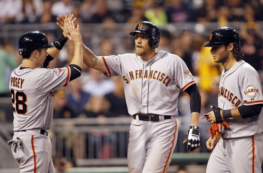 Jun 13, 2013; Pittsburgh, PA, USA; San Francisco Giants right fielder Hunter Pence (center) is greeted at home plate by catcher Buster Posey (28) and shortstop Brandon Crawford (right) after Pence hit a three run home run against the Pittsburgh Pirates during the sixth inning at PNC Park. Mandatory Credit: Charles LeClaire-USA TODAY Sports