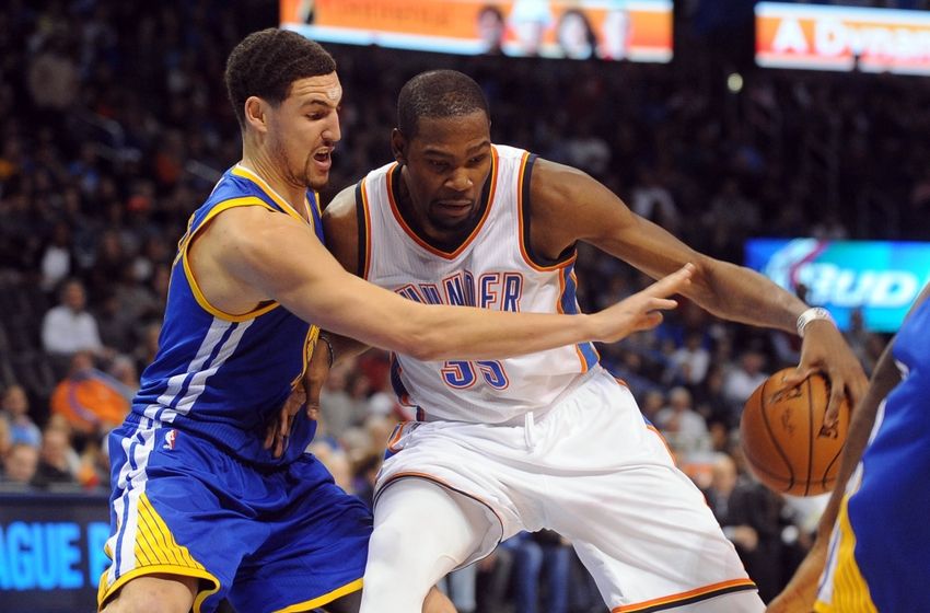 Jan 16, 2015; Oklahoma City, OK, USA; Oklahoma City Thunder forward Kevin Durant (35) handles the ball against Golden State Warriors guard Klay Thompson (11) during the fourth quarter at Chesapeake Energy Arena. Mandatory Credit: Mark D. Smith-USA TODAY Sports