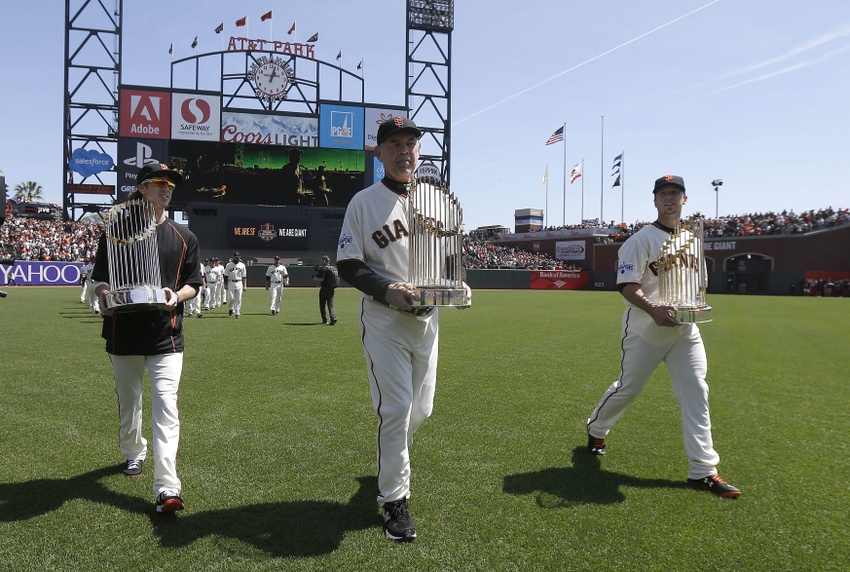 April 13, 2015 San Francisco, USA; San Francisco Giants pitcher Tim Lincecum (left) manager Bruce Bochy (center) and catcher Buster Posey (right) carry the World Series trophies from the 2010, 2012 and 2014 seasons before a baseball game against the Colorado Rockies at AT&T Park. Mandatory Credit: Jeff Chiu-Pool Photo via USA TODAY Sports
