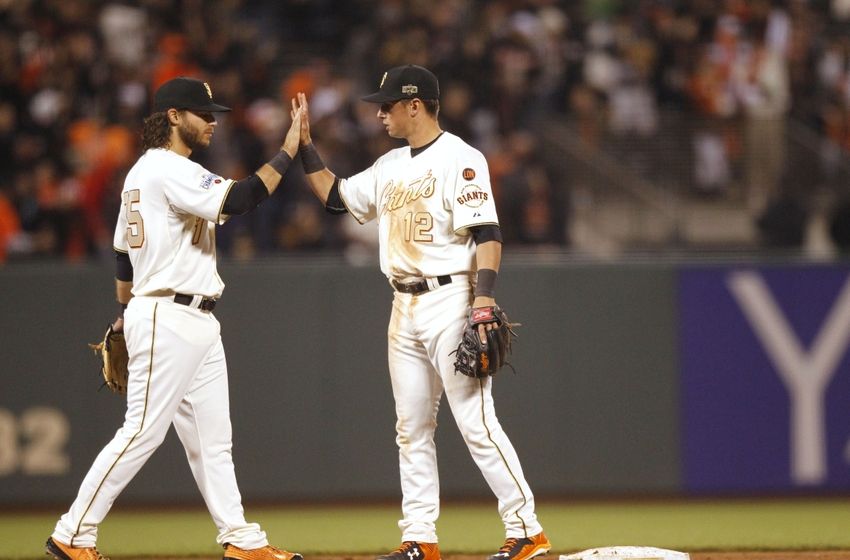 Apr 18, 2015; San Francisco, CA, USA; San Francisco Giants infielder Joe Panik (12) high fives infielder Brandon Crawford (35) after the Giants defeated the Arizona Diamondbacks 4-1 at AT&T Park. Mandatory Credit: Cary Edmondson-USA TODAY Sports
