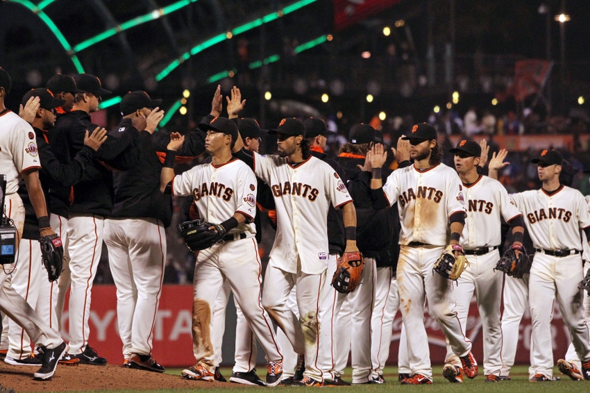 Apr 21, 2015; San Francisco, CA, USA; San Francisco Giants celebrate their 6-2 win over the Los Angeles Dodgers at AT&T Park. Mandatory Credit: Lance Iversen-USA TODAY Sports