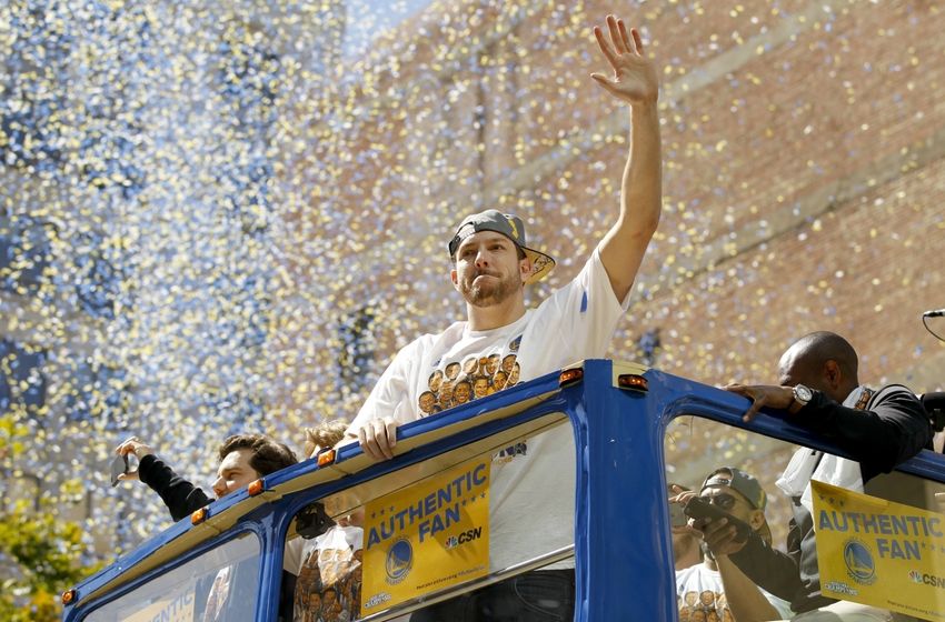 Jun 19, 2015; Oakland, CA, USA; Golden State Warriors forward David Lee waves to the crowd during the Golden State Warriors 2015 championship celebration in downtown Oakland. Mandatory Credit: Cary Edmondson-USA TODAY Sports