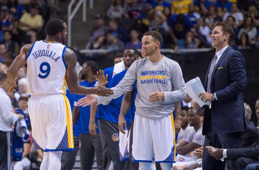 October 5, 2015; San Jose, CA, USA; Golden State Warriors guard Andre Iguodala (9) high-fives guard Stephen Curry (30, center) as interim head coach Luke Walton looks on during the fourth quarter in a preseason game against the Toronto Raptors at SAP Center. The Warriors defeated the Raptors 95-87. Mandatory Credit: Kyle Terada-USA TODAY Sports